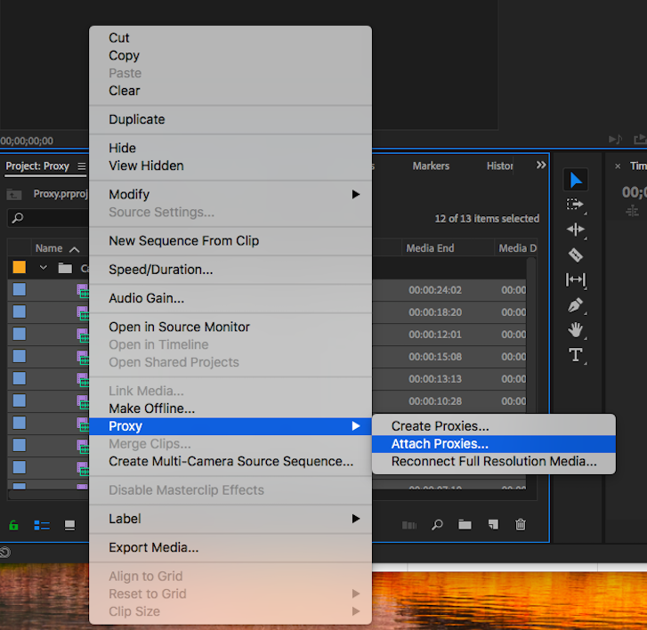 Cách tạo proxy: Right-click vào footage > Create Proxy > Movie, chọn preset phù hợp.