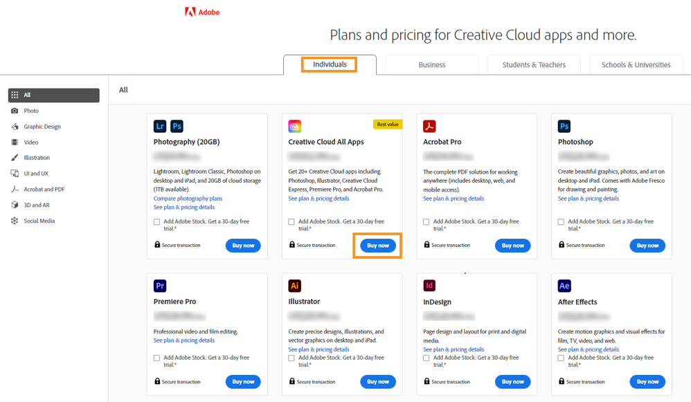 Photography Plan: $9.99/tháng - bao gồm Photoshop và Lightroom Single App Plan: $22.99/tháng - chỉ Photoshop All Apps Plan: $59.99/tháng - toàn bộ Creative Suite