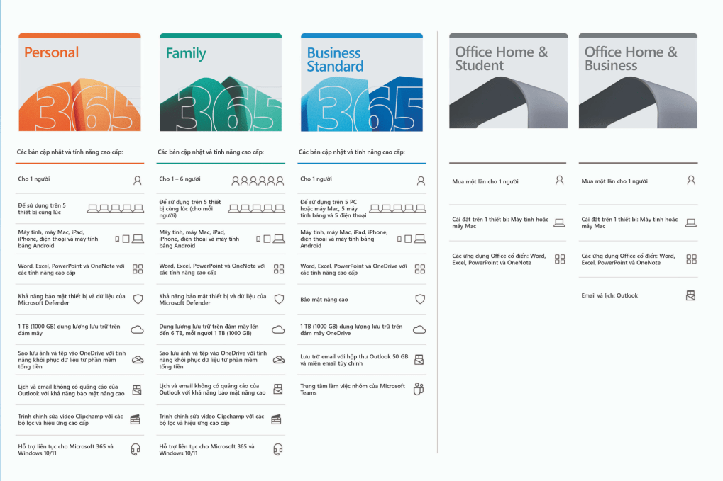 Q: Có thể dùng Microsoft 365 trên nhiều thiết bị không? A: Có. Gói Personal cho phép cài trên 5 PC/Mac + 5 tablet + 5 smartphone. Gói Family thì mỗi user được 5 thiết bị.