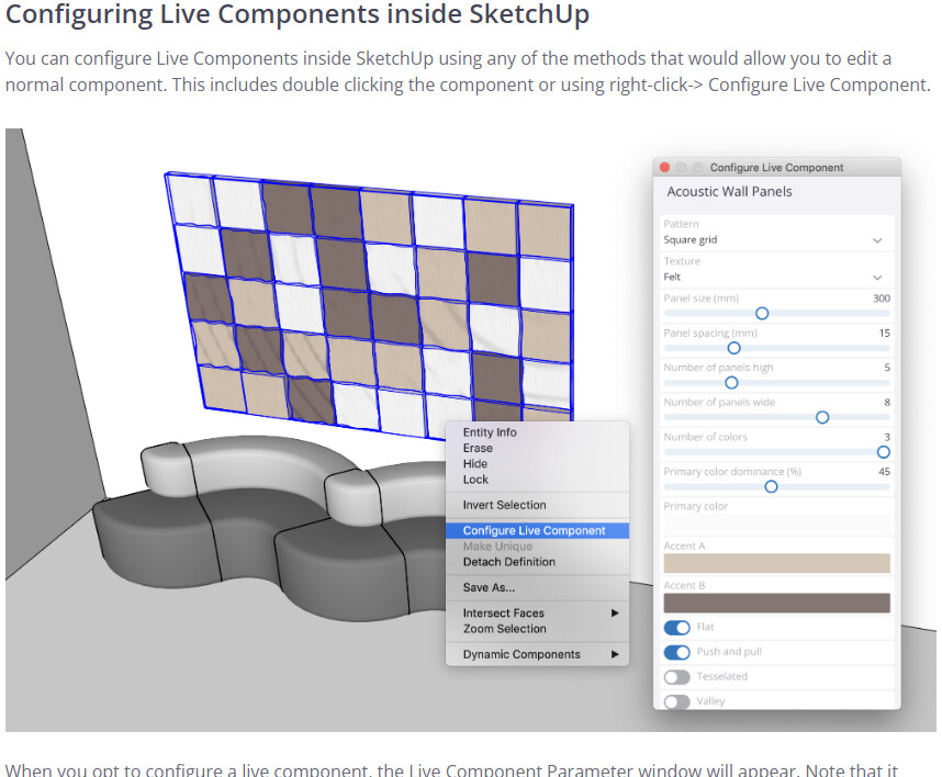 Live Components chính là điểm nhấn đặc biệt của SketchUp Pro 2021. Tính năng này cho phép tạo ra các thành phần có thể tương tác được, như cửa có thể mở/đóng, cửa sổ có thể trượt. Thay vì phải vẽ từng trạng thái khác nhau, bạn chỉ cần kéo thả là xong! Đúng kiểu "làm một lần, dùng muôn đời".